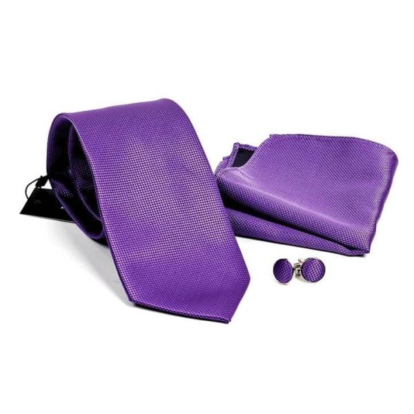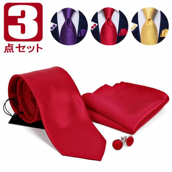 ネクタイ カフスボタン ポケットチーフ 3点 セット シルク ネクタイ チーフ カフス メンズ ビビッドなソリッド無地 3色 パープル レッド イエロー