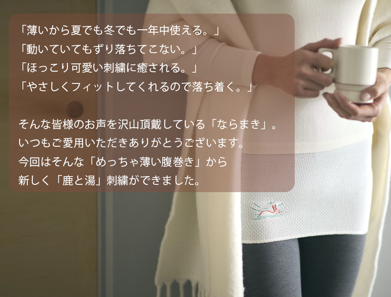 ならまき めっちゃ薄い腹巻き 鹿と湯 日本製 ウエストウォーマー 綿+絹 白 黒 SM ML 奈良の鹿刺繍 温活 妊活 冷え症 腹痛 腰痛 ギフト 贈り物