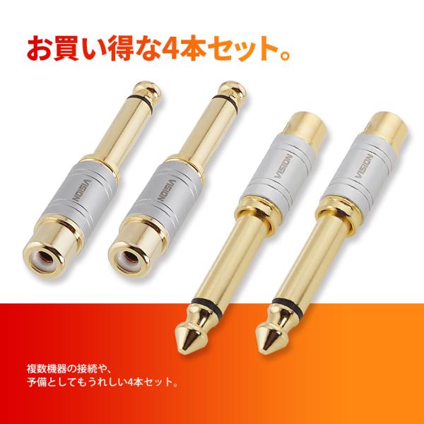 VISION 6.35mmオス to RCAメス 変換アダプタ 4本セット モノラル 標準プラグ フォーン端子 1/4インチ ピンプラグ 金メッキ アダプター コネクタ 225074