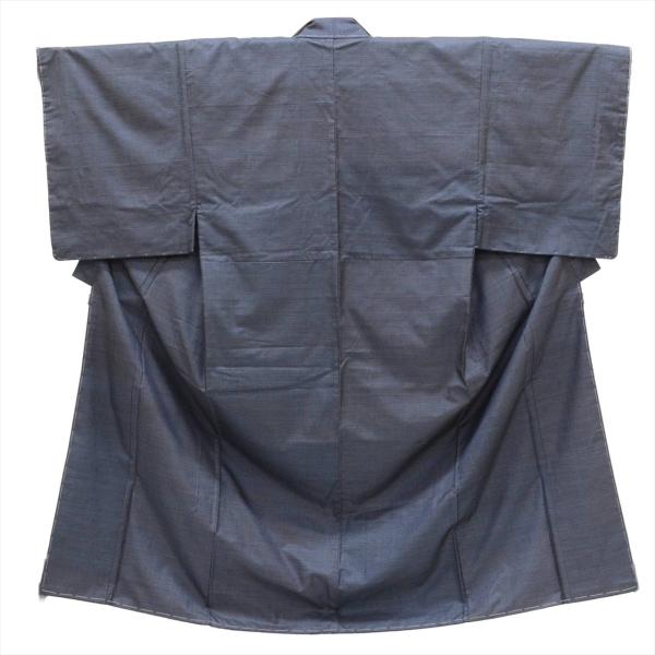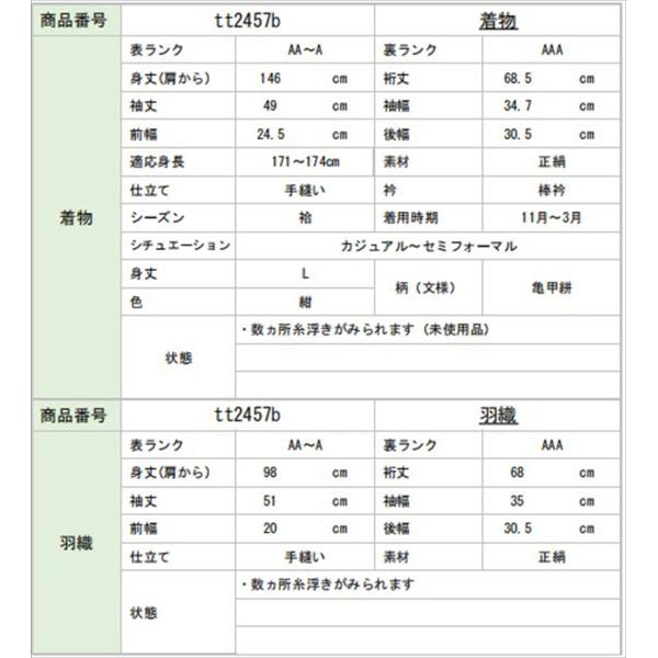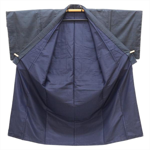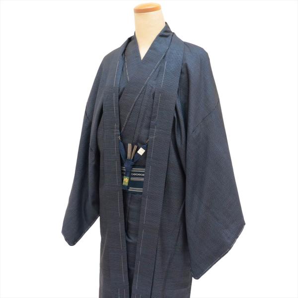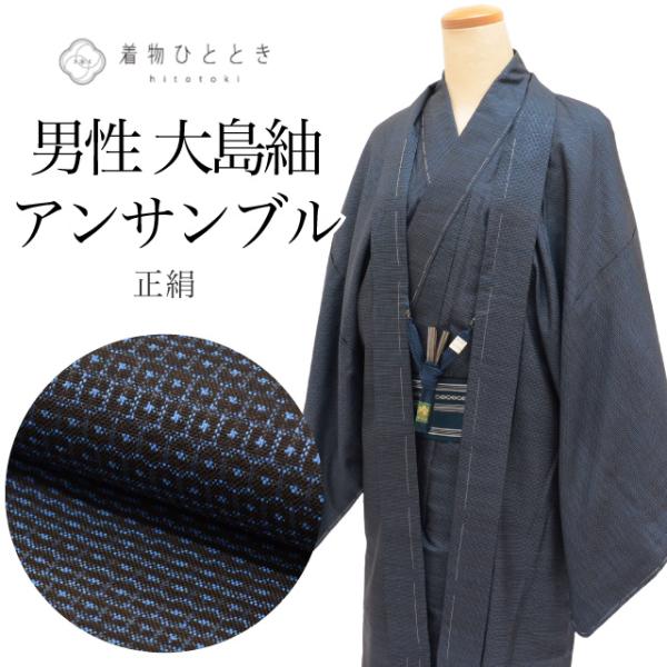 着物 羽織 セット アンサンブル 男性 本場大島紬 手織り 正絹 未使用品 身丈146cm L 裄68.5cm 紺色系 亀甲絣文様 角帯 羽織紐付き メンズ 証紙 中古 tt2457b