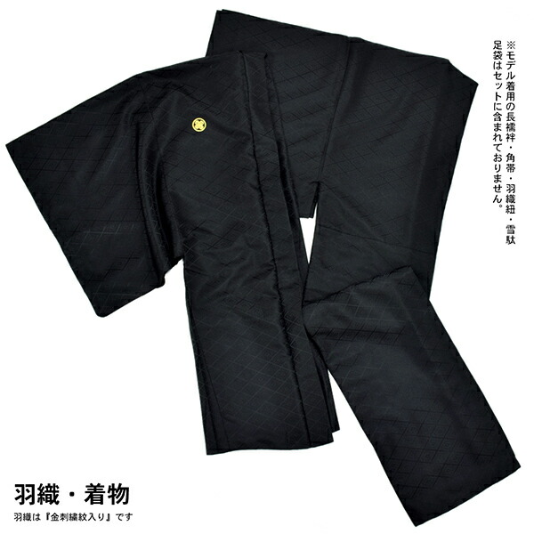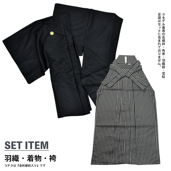 男性 メンズ 金刺繍紋入り 羽織袴セット 「黒・白 菱、金刺繍紋」 紋付き袴 紋付袴 黒紋付 白紋付 成人式 卒業式 結婚式 地紋入り (メール便不可)