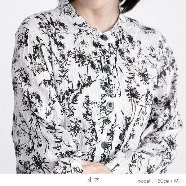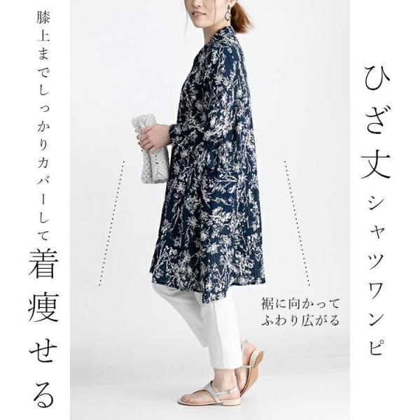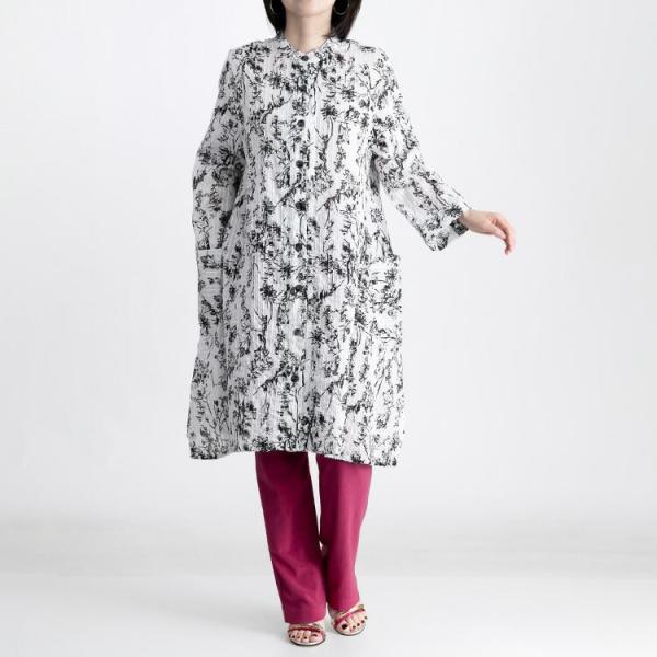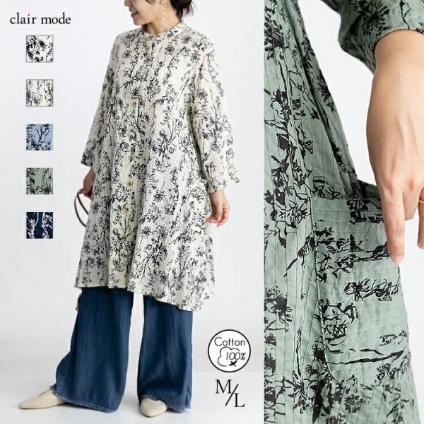 【送料無料】 植物プリント ピンタック シャツ ワンピース 5色 洗える レディース ワンピース ロングチュニック 前あき ボタン留め