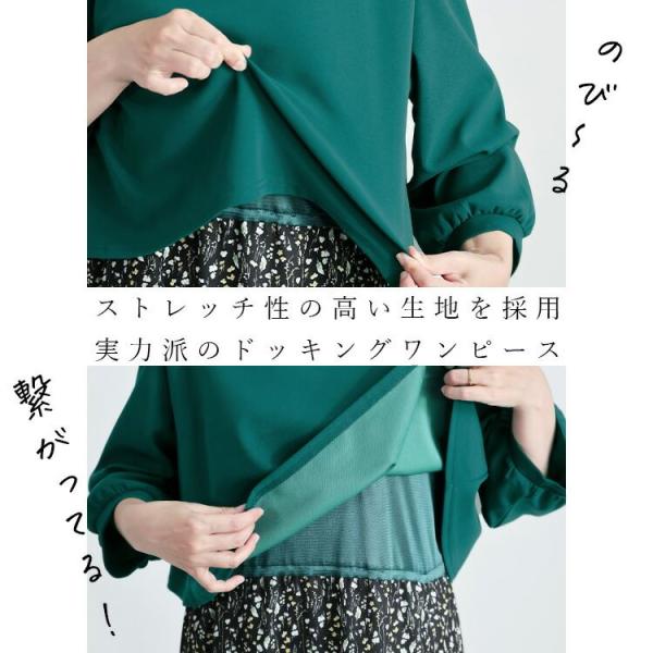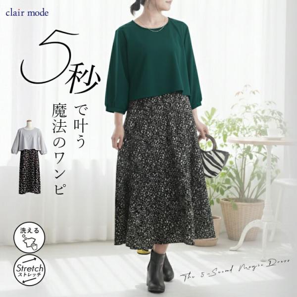 【送料無料】 レイヤード風ワンピース 2色 M L 洗える 七分袖 レディース トップス ワンピース クルーネック ロング丈 体型カバー 花柄 ドット 春秋
