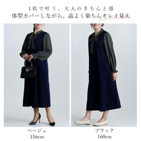 【送料無料】 ボウタイドッキングワンピース M L 洗える 長袖 レディース ワンピース ラウンドネック ボウタイ リボン 花柄 体型カバー 春秋冬