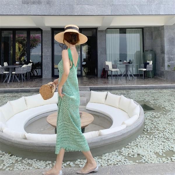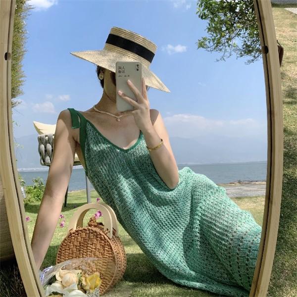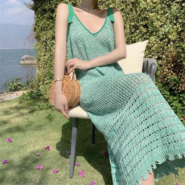 リゾートワンピース レディース サマードレス ニット 夏ワンピ ロング おしゃれ ファッション 春夏 カジュアル きれいめ ハワイ 沖縄 旅行用 グリーン