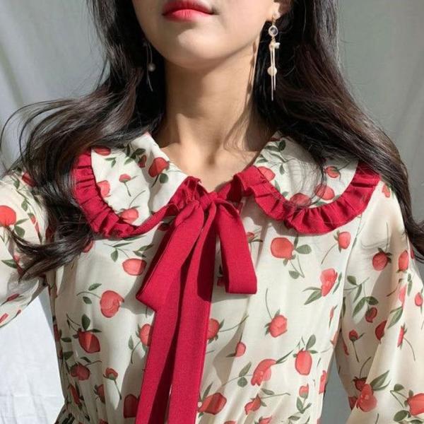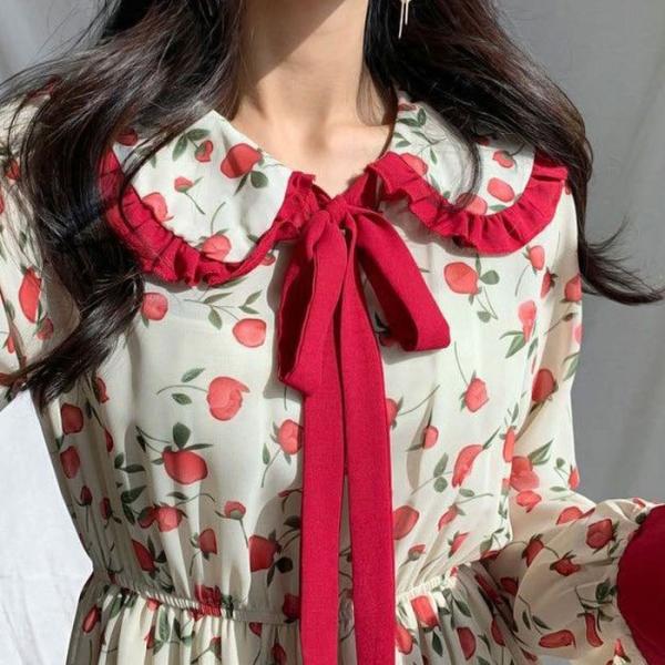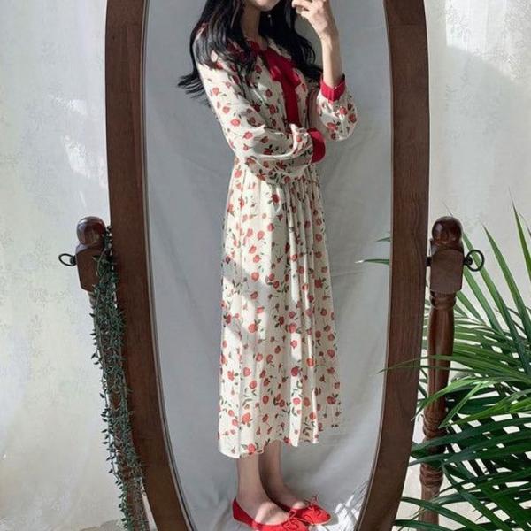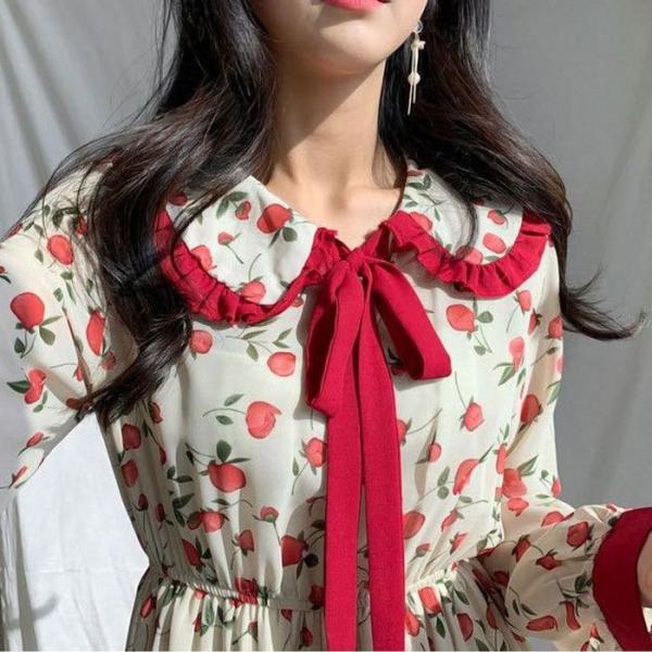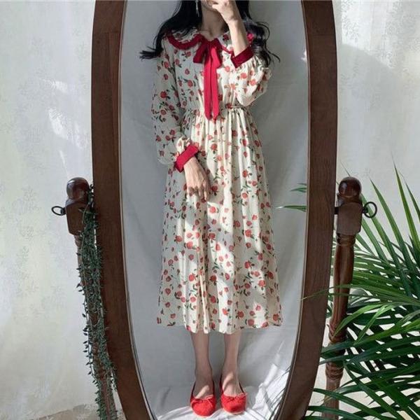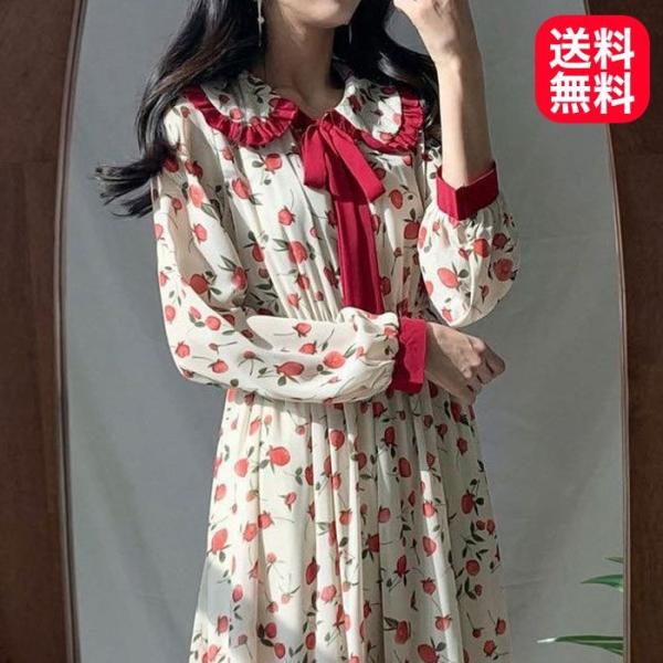 ワンピース ミモレ丈 長袖 花柄 フレア リボン フリル ガーリー フェミニン 可愛い おしゃれ トレンド レトロ 送料無料