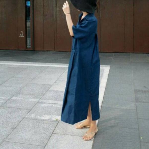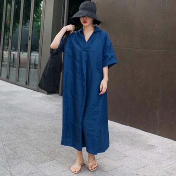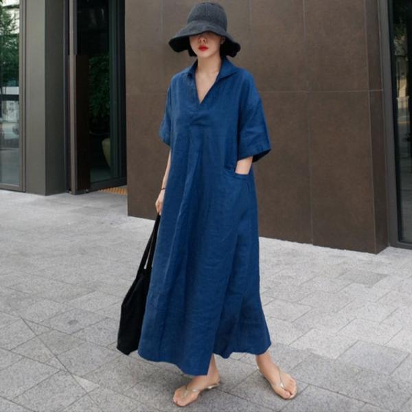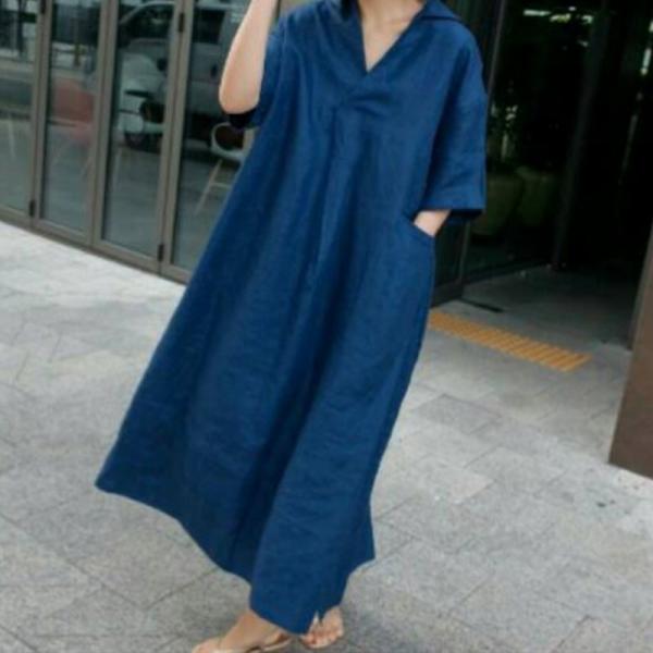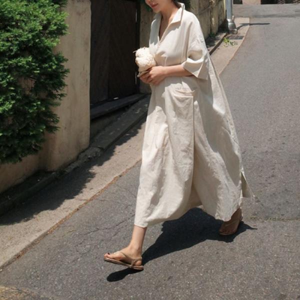 グレージュ ロングワンピース ロングワンピ シンプル 綿麻 リネン Vネック
