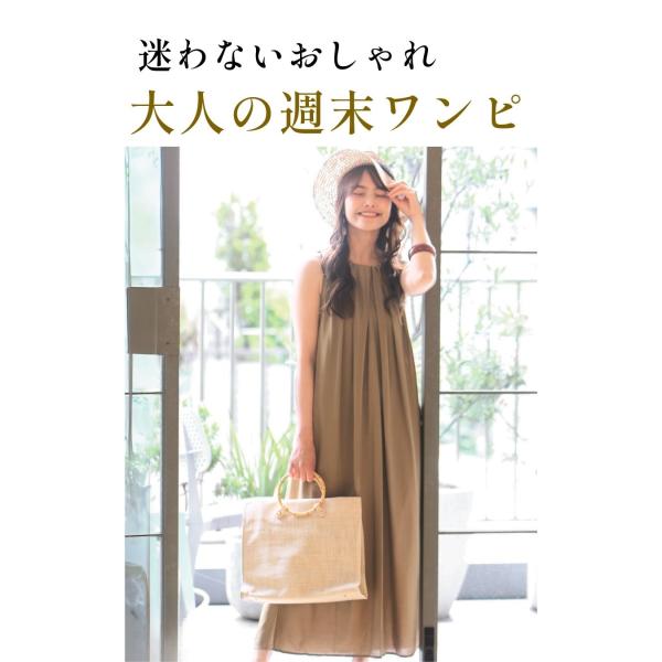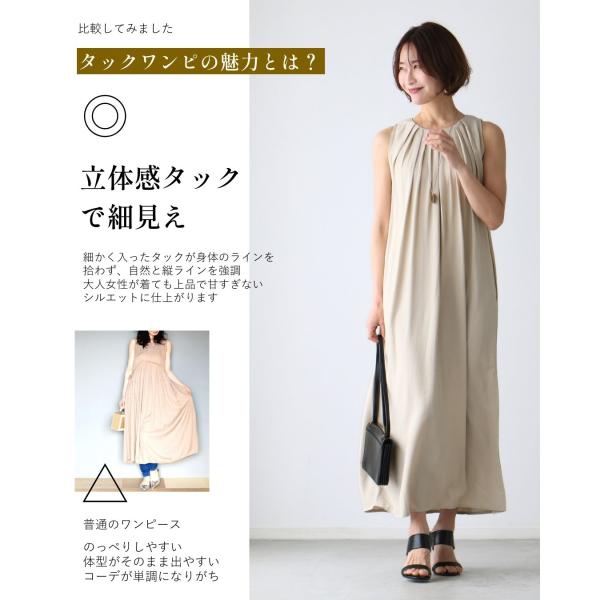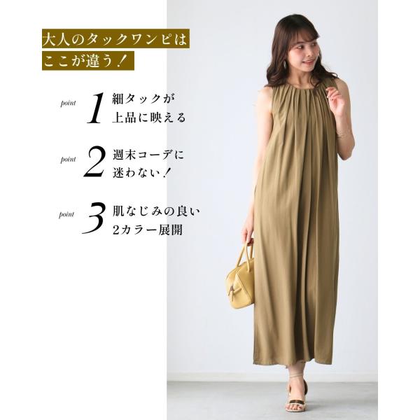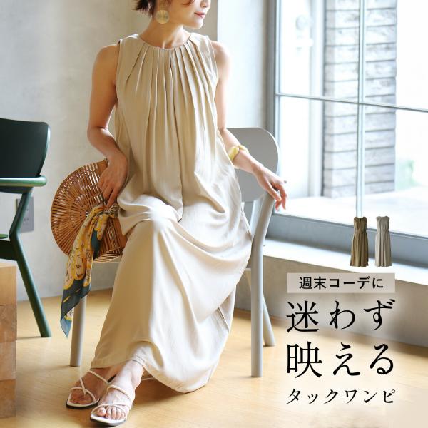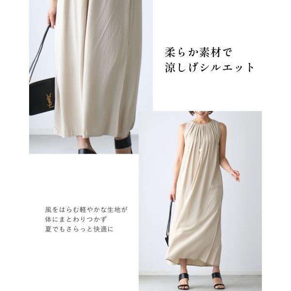 ワンピース ノースリ ドレープ タック 抜け感 とろみ 薄手 光沢感 柔らかい ポケット 後ろボタン 立体感 上品