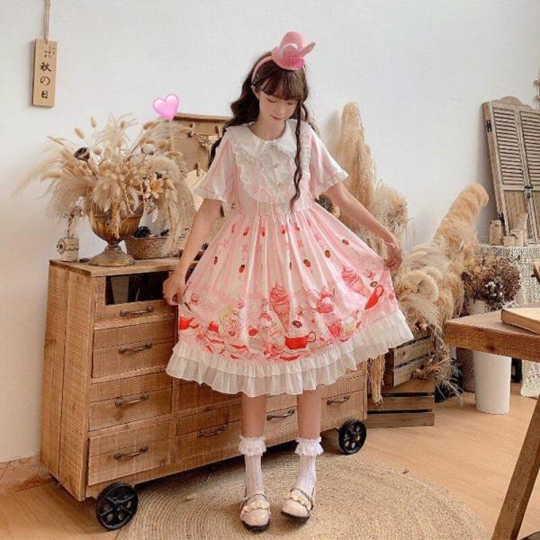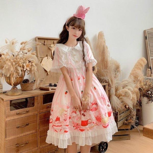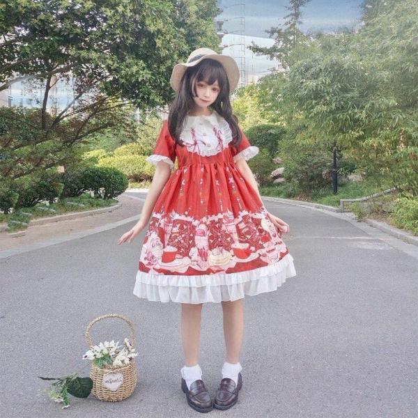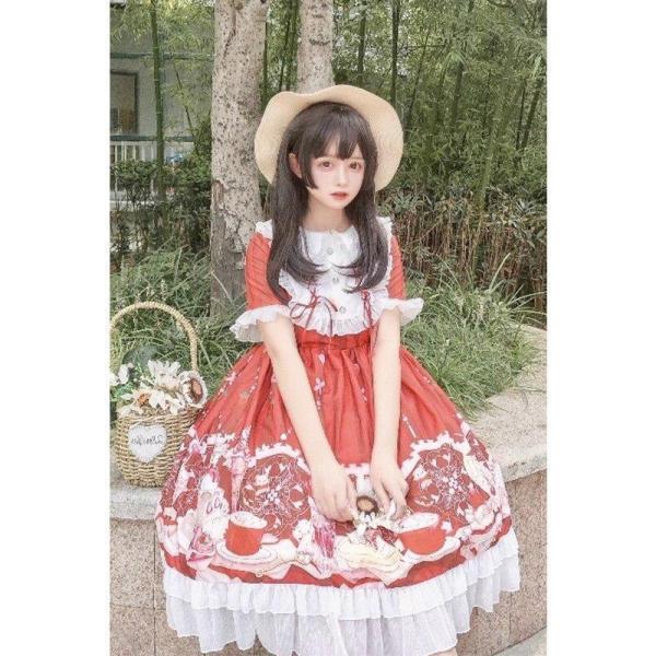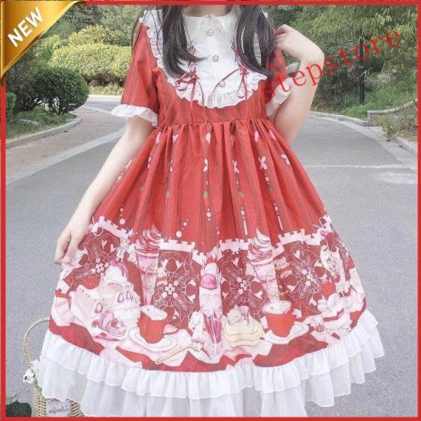 原宿新夏 jsk 甘い漫画プリントロリータドレスピンク赤かわいい人形の襟ソフト姉妹半袖ティーパーティー op ドレス