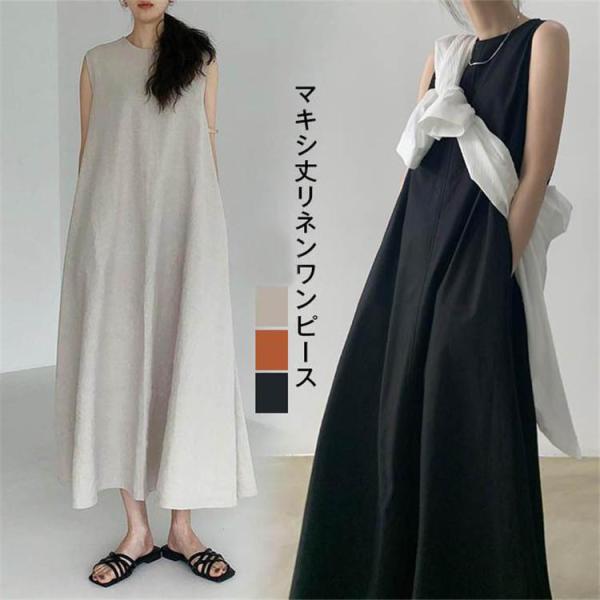 マキシワンピース レディース フレア裾 夏 春 黒 ブラックワンピース マキシ丈 フレア Aライン ノースリーブ ゆったり 体型カバー 大きいサイズ