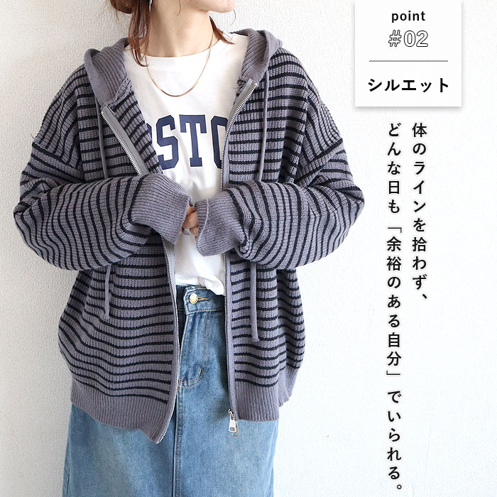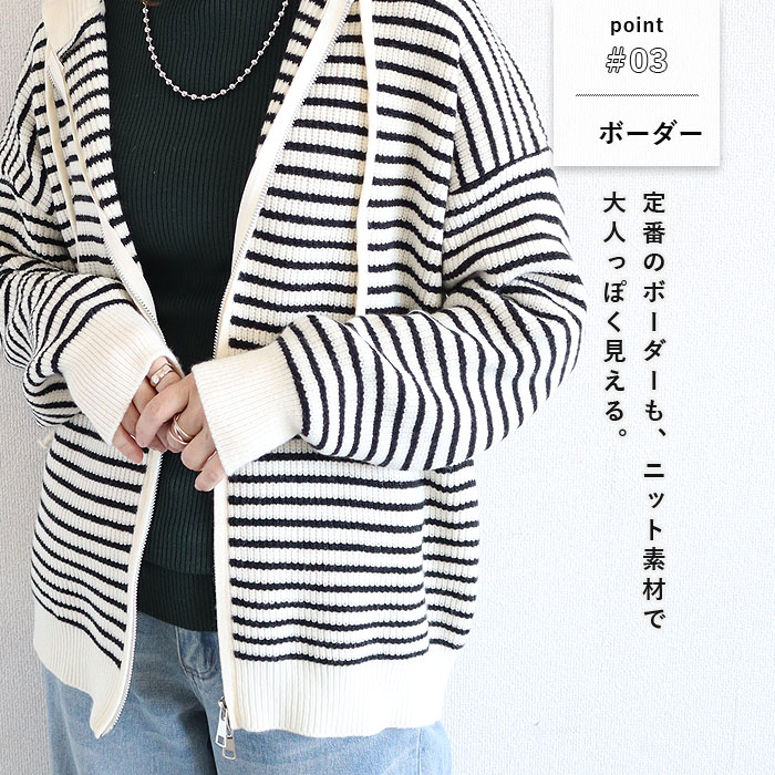 1743円 3点購入クーポンで! ジップ パーカー トップス レディース ジップアップ ダブルジップ ニット 秋 冬 白 黒 おしゃれ 長袖 ボーダー アウター ^t1129^