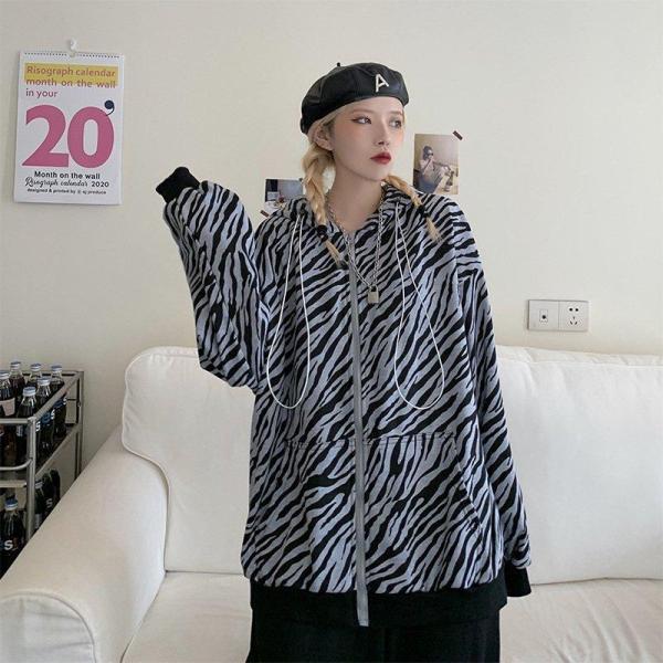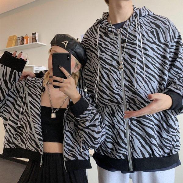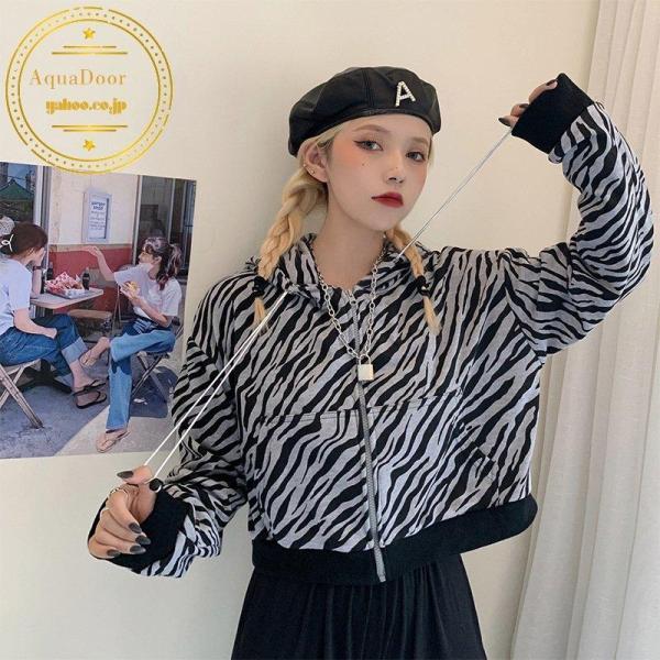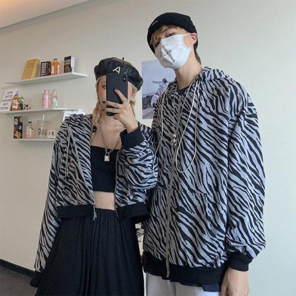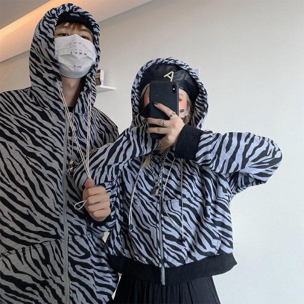 パーカーショート丈原宿系トップスレディースメンズ男女兼用韓国ファッションゼブラ柄前開きジップアップロングパーカ秋服アウターストリート系