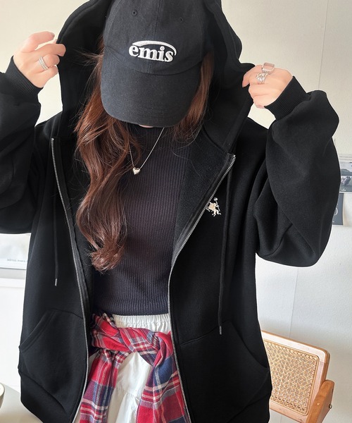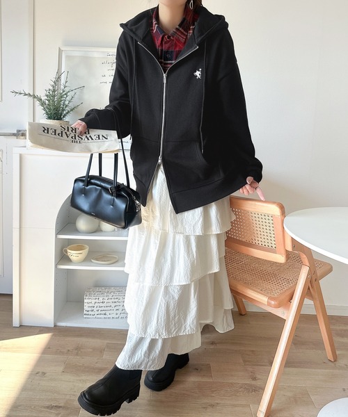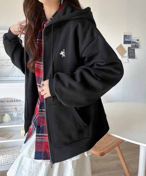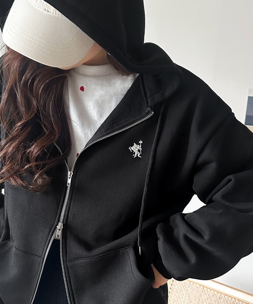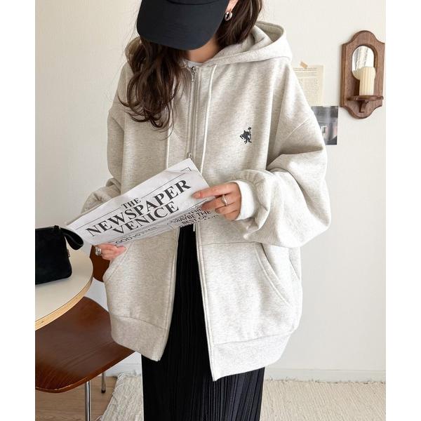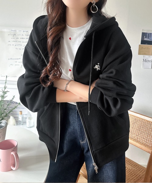 パーカー 羽織って暖か、さらりと洒落感。胸元ワンポイント刺繍裏起毛ダブルジップパーカー(長袖) レディース