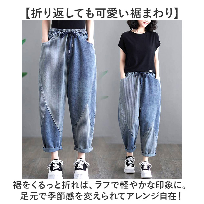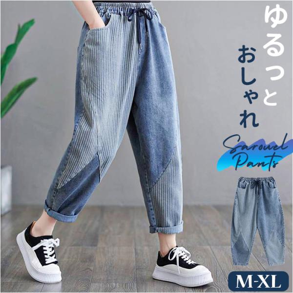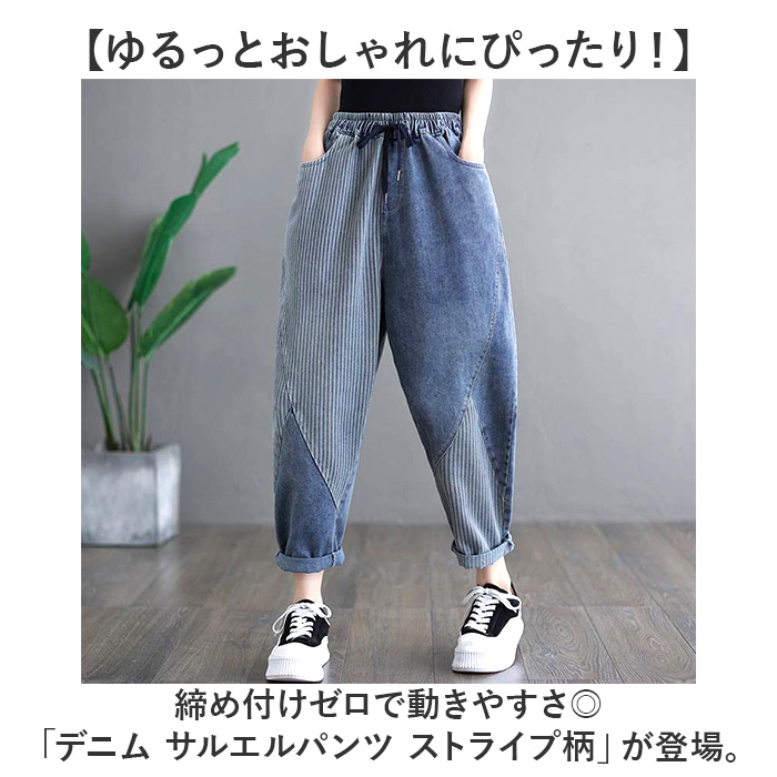 デニムパンツ レディース ストライプ 通販 サルエルパンツ ズボン パンツ ジーパン ジーンズ デニム サルエル レディースパンツ 9分丈 九分丈 デニムパンツ