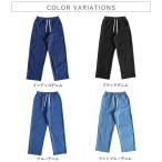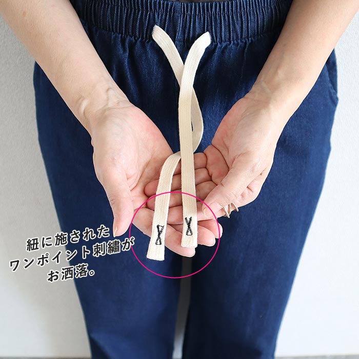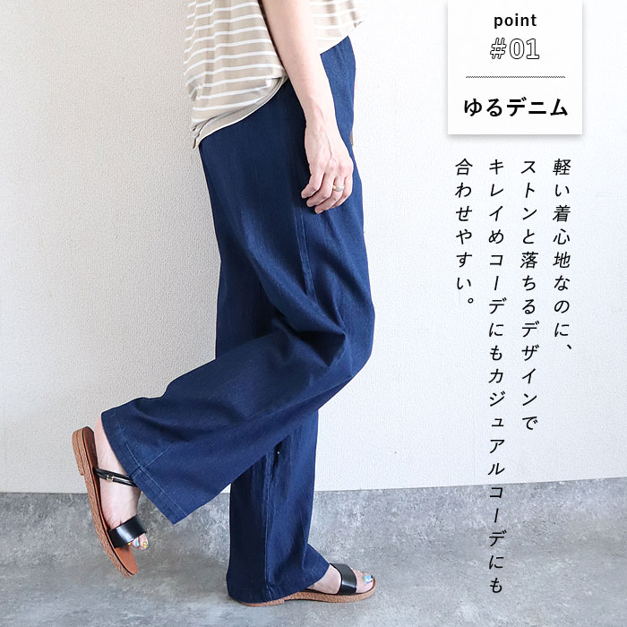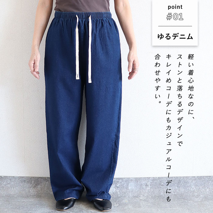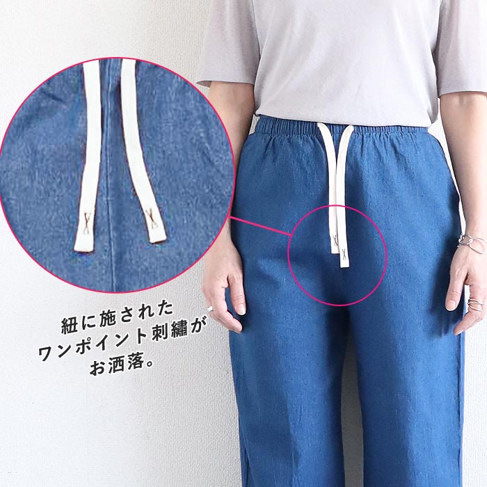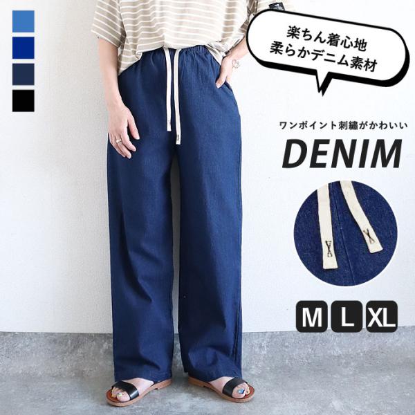 レディース デニム セミワイド パンツ ボトムス 春 夏 紐 ウエストゴム 30代 40代 50代 無地 コットン混 綿混 [郵3]^b457^