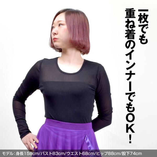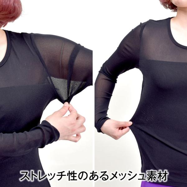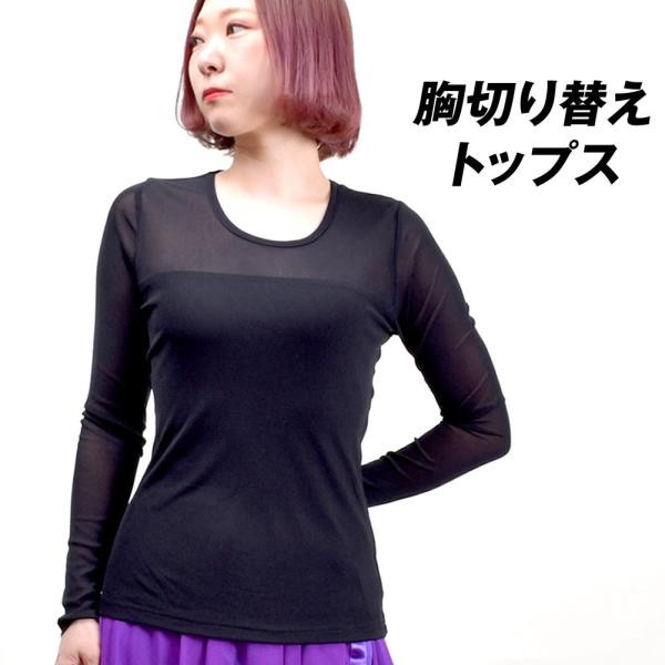 トップス カットソー ダンスウェア フラダンス 社交 シースルー 無地トップス ダンス着 インナー 胸切り替え伸縮素材 長袖 メッシュ 丸首 BD94109 [M便 1/2]