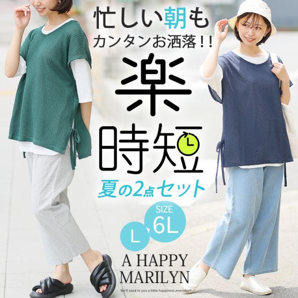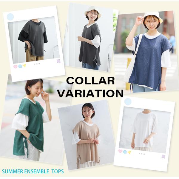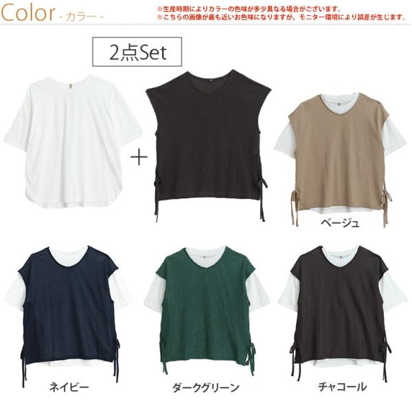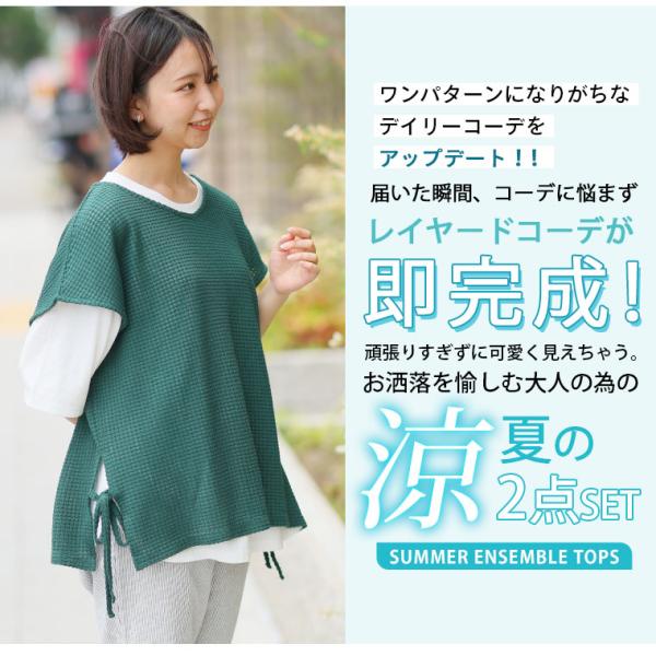 大きいサイズ レディース アンサンブル コーデがマッチ ワッフル風ベスト & ゆるTシャツ アンサンブル トップス コーデセット 2点セット LL 3L 4L 5L A