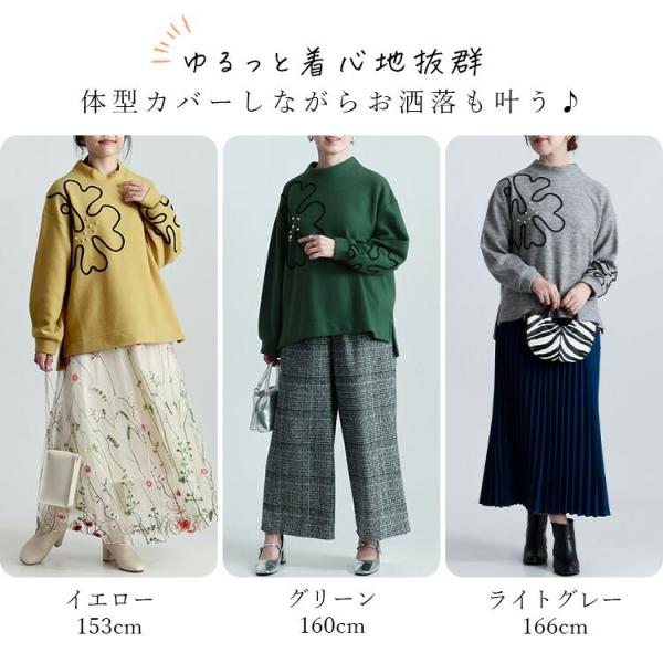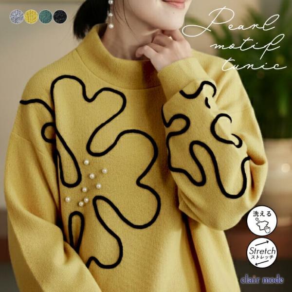 【送料無料】パール&コード刺繍チュニック 4色 M L 洗える 長袖 レディース トップス ニット カットソー ハイネック ストレッチ 体型カバー 春秋冬