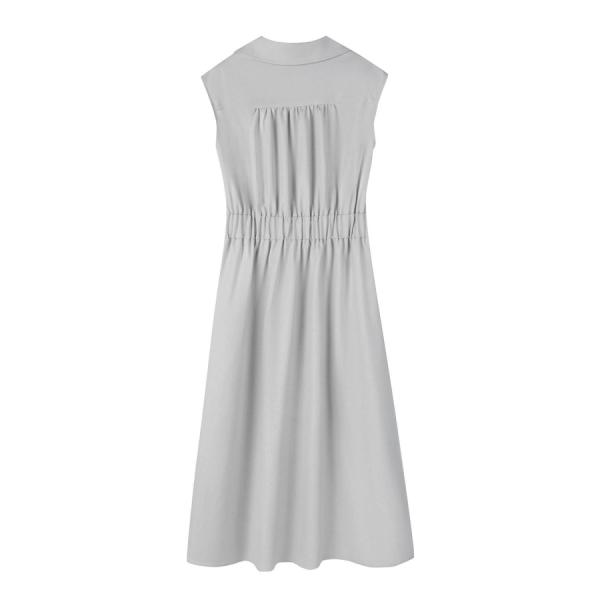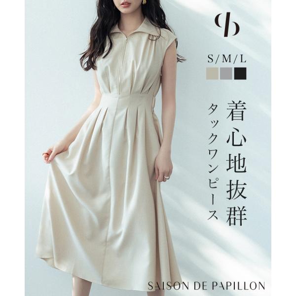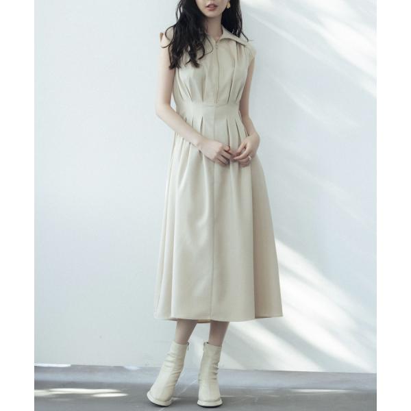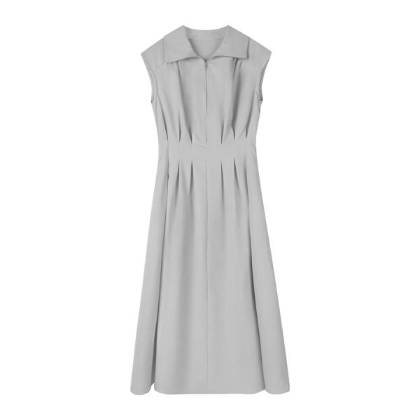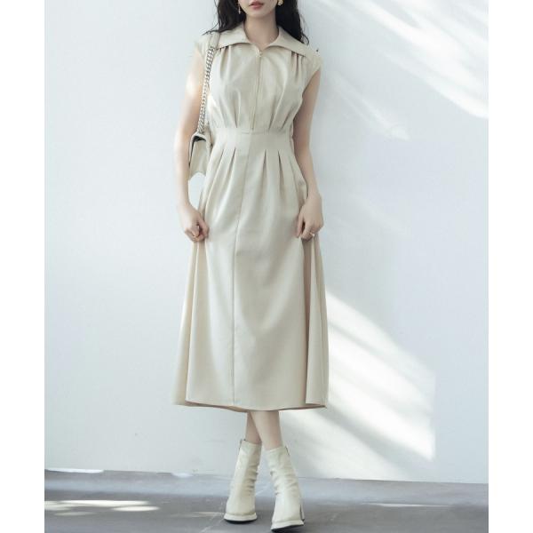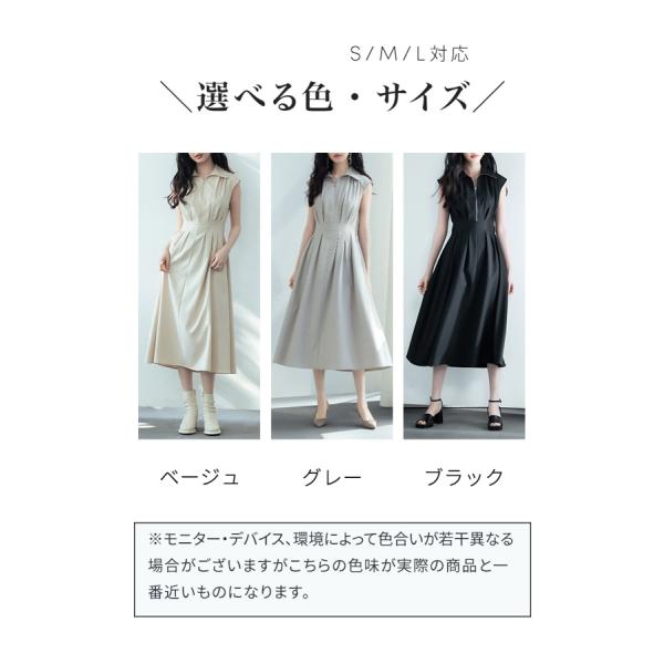 ワンピース レディース ミモレ丈 ジップ付き シャツ襟 ウエストマーク 体型カバー ハイウエスト フレアシルエット フレンチスリーブ ノースリーブ ウ