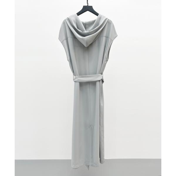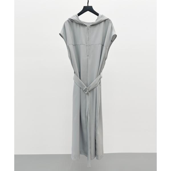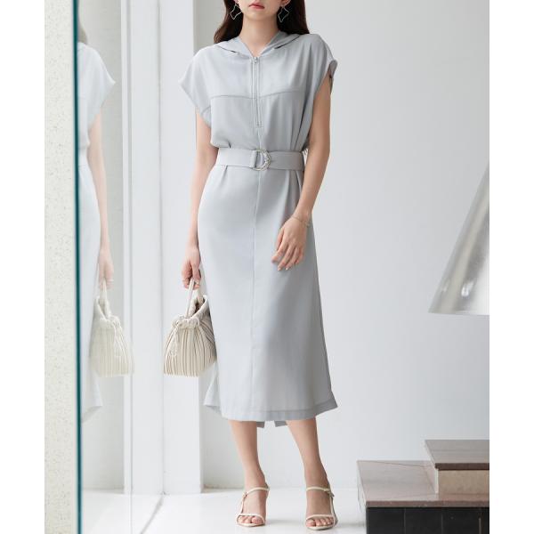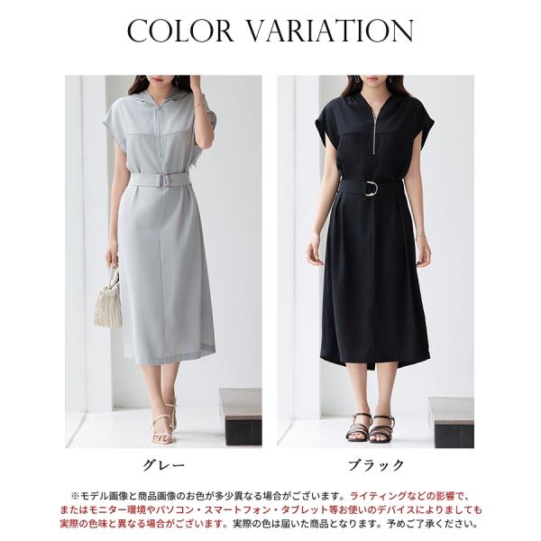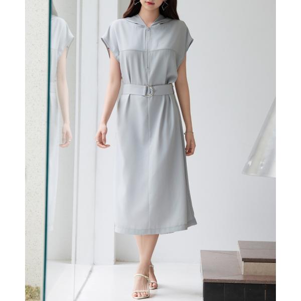 ワンピース レディース ジャンパースカート ジップパーカーワンピース フード付き フレンチスリーブ ミモレ丈 取り外し可能ベルト付き バック裾スリ