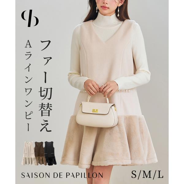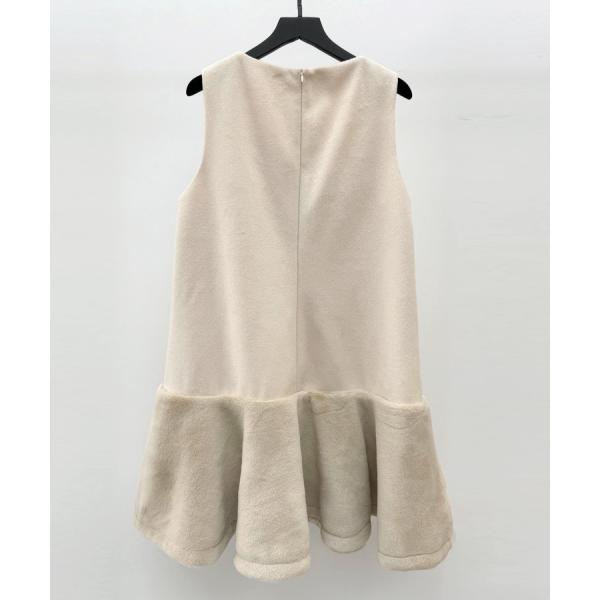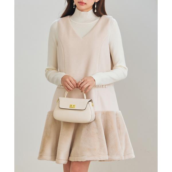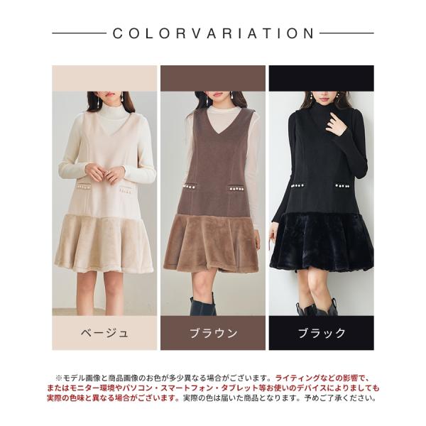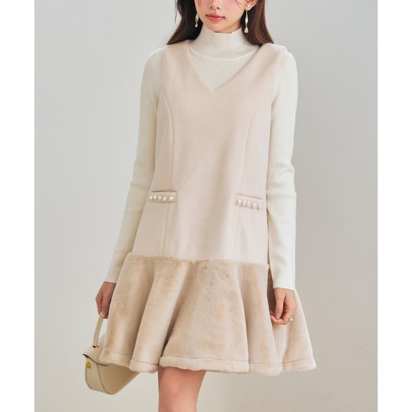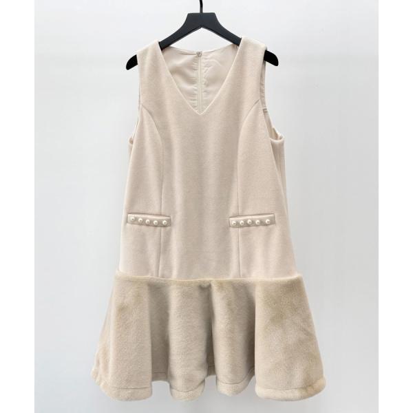 ワンピース レディース ノースリーブワンピース 異素材ドッキング ファー付き パール付き ミニ丈 Vネック レイヤード フレアシルエット 裾フレア 暖
