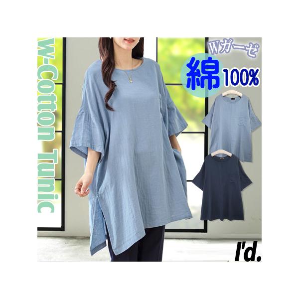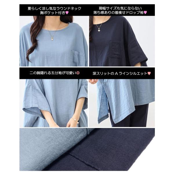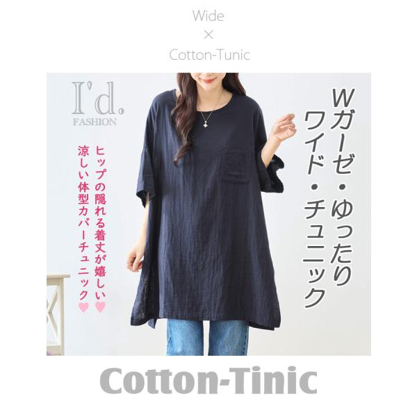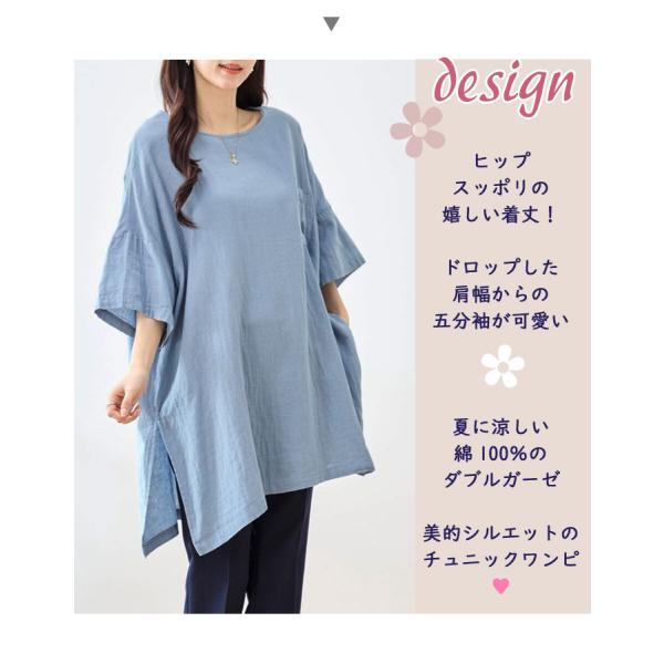 綿100% ダブルガーゼ 二の腕隠れる チュニック ワンピース ワイド幅 ゆったり 五分袖 七分袖 半袖 春夏 レディース オーバーサイズ M L LL 5907
