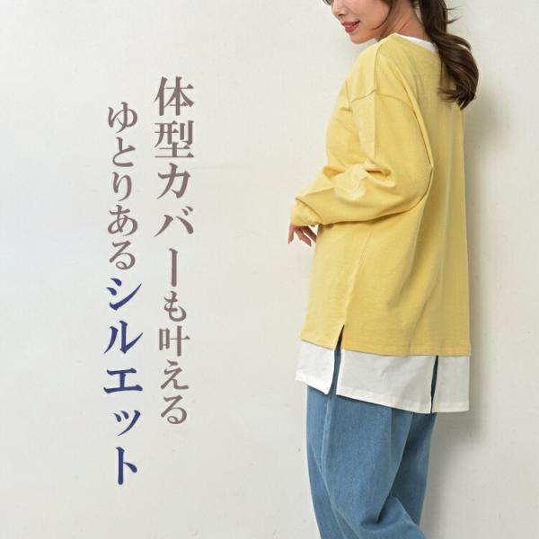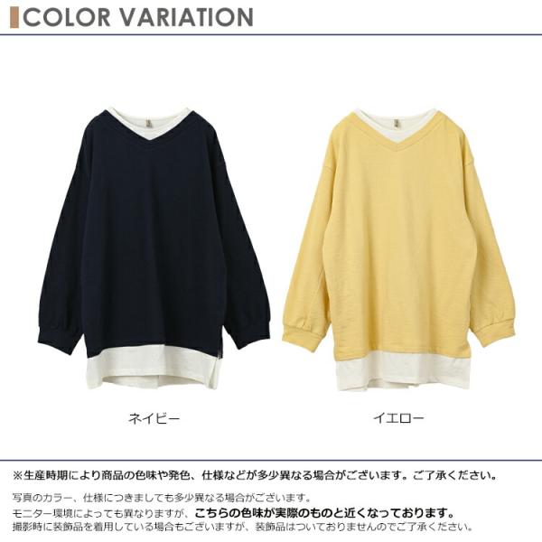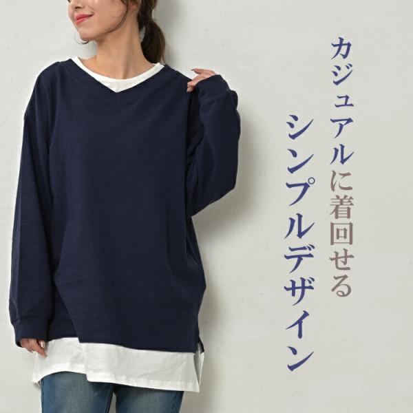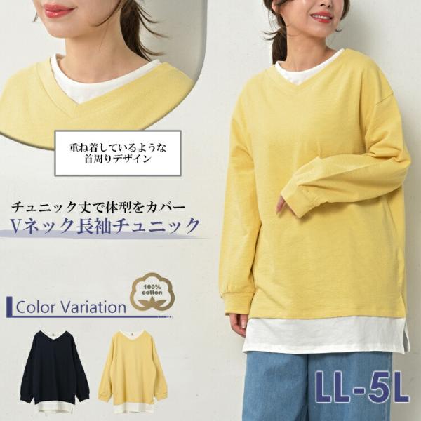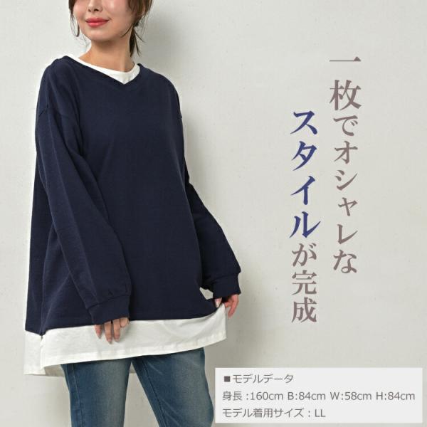 重ね着風チュニック 大きいサイズ レディース 長袖 切り替え Vネック フェイクデザイン トップス LL 3L 4L 5L