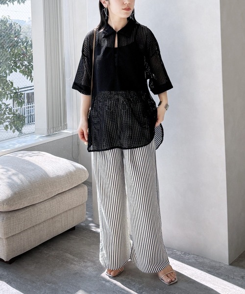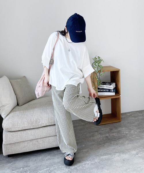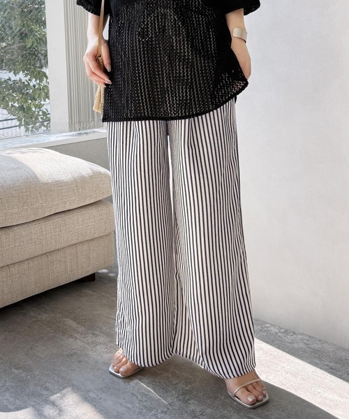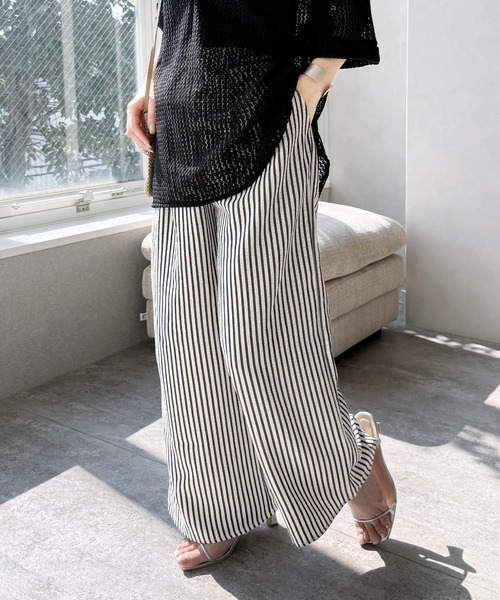 パンツ 無地/ストライプエンボス加工イージーパンツ レディース