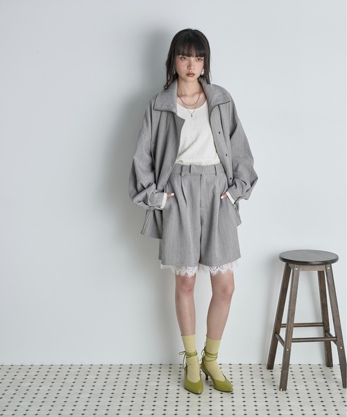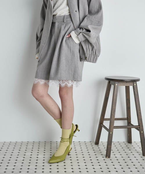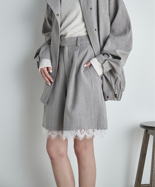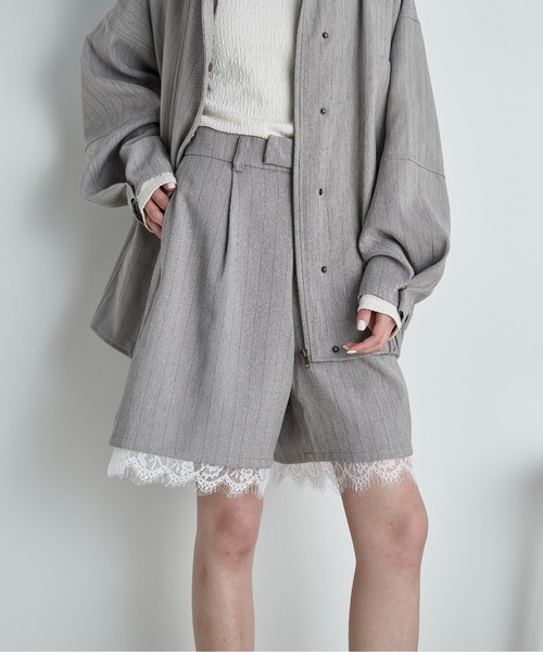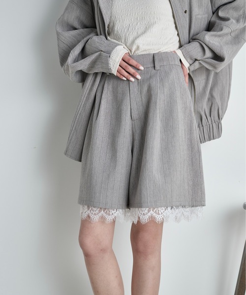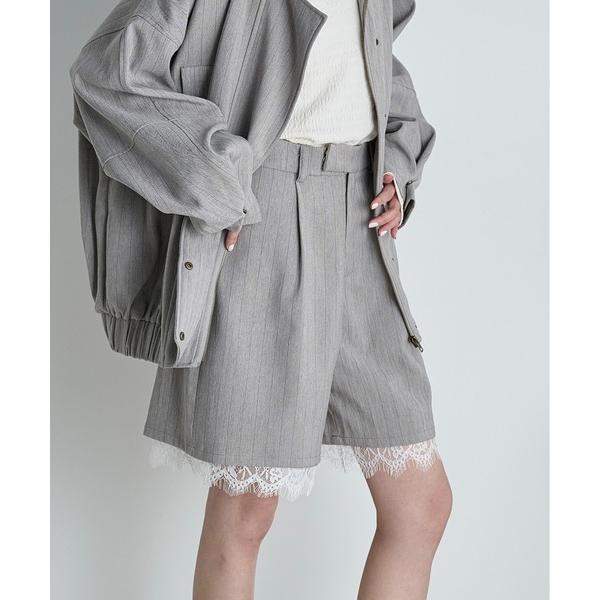 パンツ レースレイヤードヘムピントライプタックフレアショートパンツ レディース