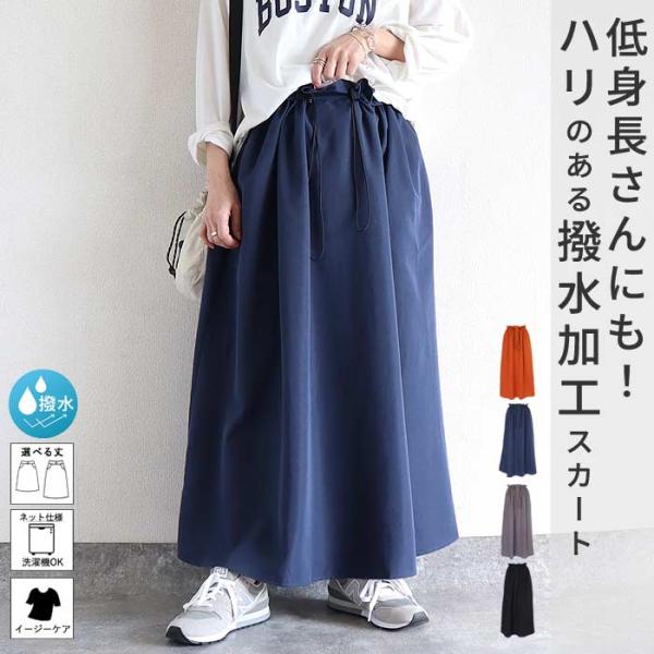 スカート レディース フレアスカート ボトムス 撥水 春 夏 黒 選べる丈 おしゃれ ウエストゴム 楽ちん 高身長 低身長 シャリ感[郵2]^b516^