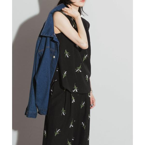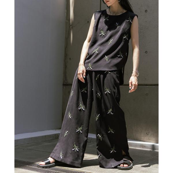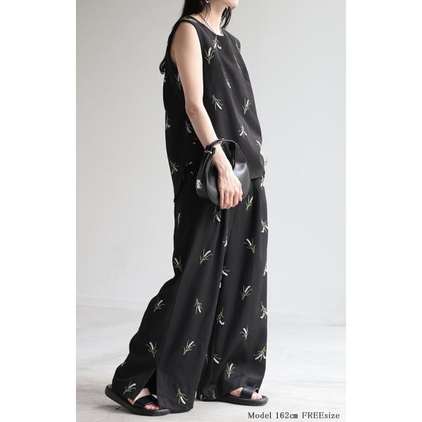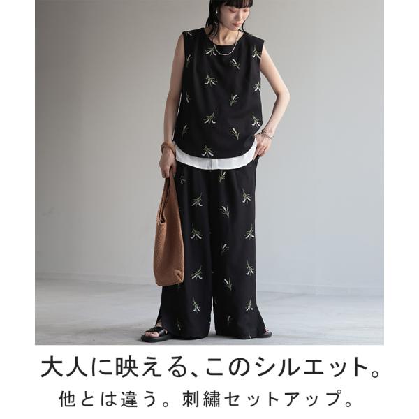 セットアップ パンツ 刺繍 タンクトップ レディース ワイド ロング ワイドパンツ トップス 太い ズボン ハイウエスト ノースリーブ