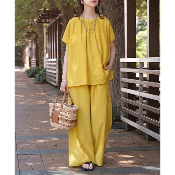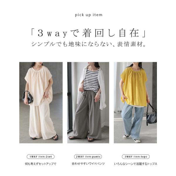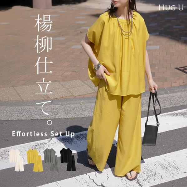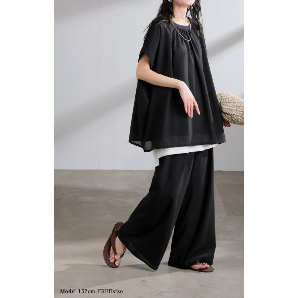 セットアップ 上下セット 2点セット レディース ボトムス パンツ トップス ブラウス フレンチスリーブ ギャザー 楊柳 ジョーゼット 半袖 ワイドパンツ ロング
