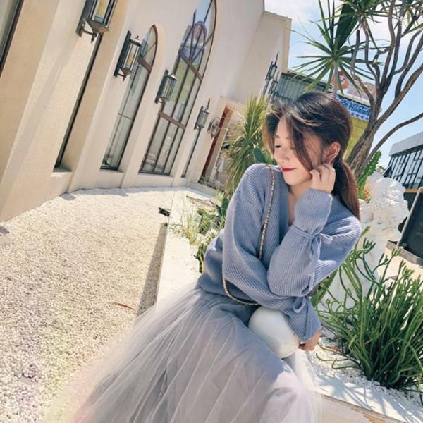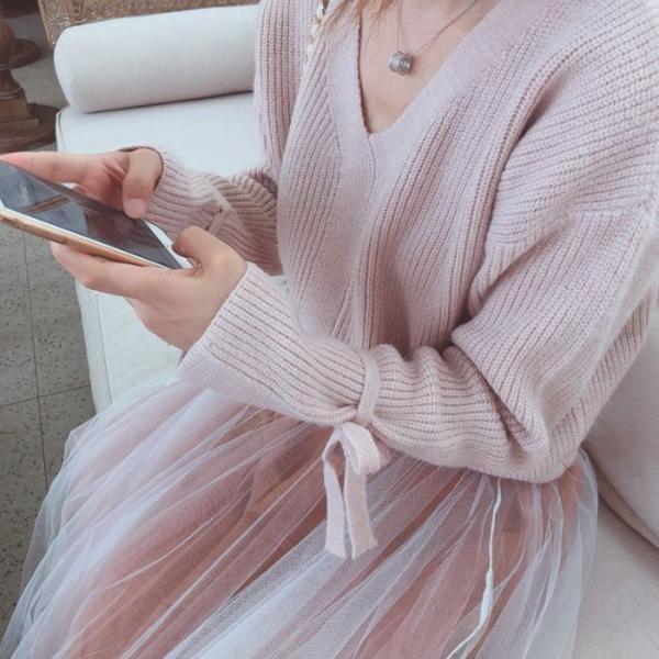 ニット ロングスカート セット セーター シフォン スカート リボン ガーリー 長袖 ピンク ブルー 大人可愛い エレガント 上品 送料無料