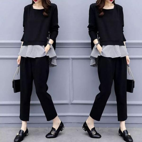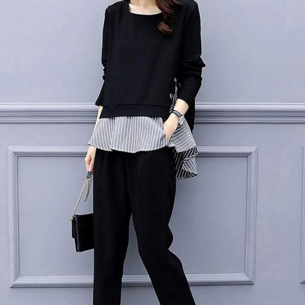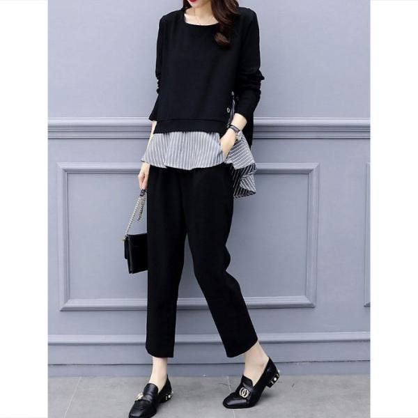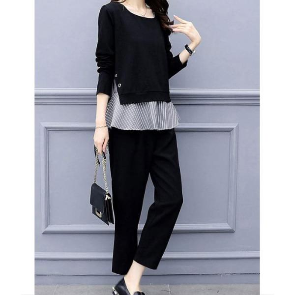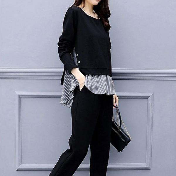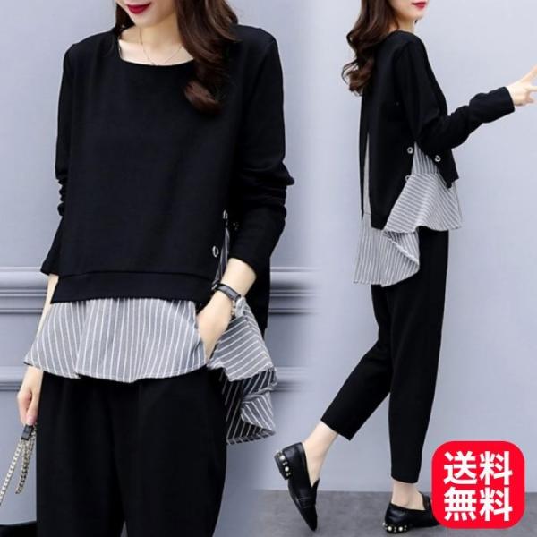 セットアップ スウェット重ね着風 サルエル パンツ 長袖 ブラウス 上下セット ゆったり カジュアル 体型カバー 送料無料