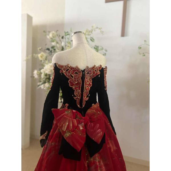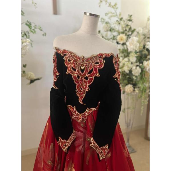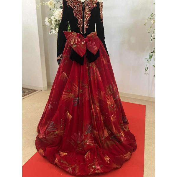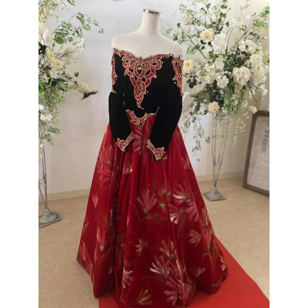 貸衣装処分品 カクテルドレス マダムグレ 黒赤豪華ドレスベルベット素材にペインティング模様