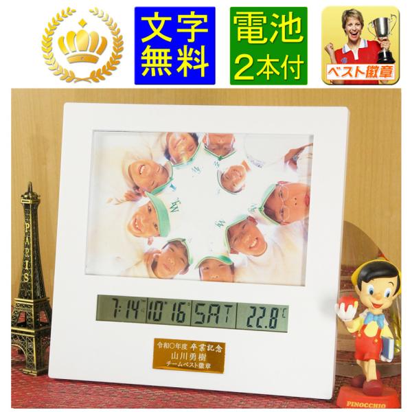 卒業記念品 文字無料 電池付 フォトフレーム(白色) 名入れ無料 時計付 高さ185mm 写真立て 卒団記念 卒園記念品 卒部 野球 敬老 ND-D3087G金プレート