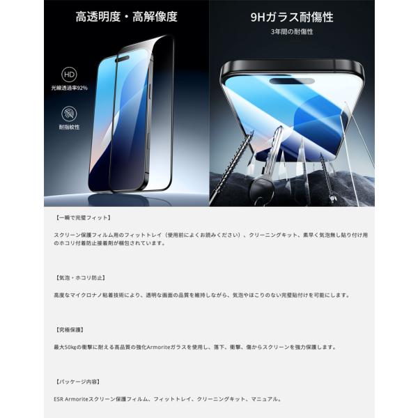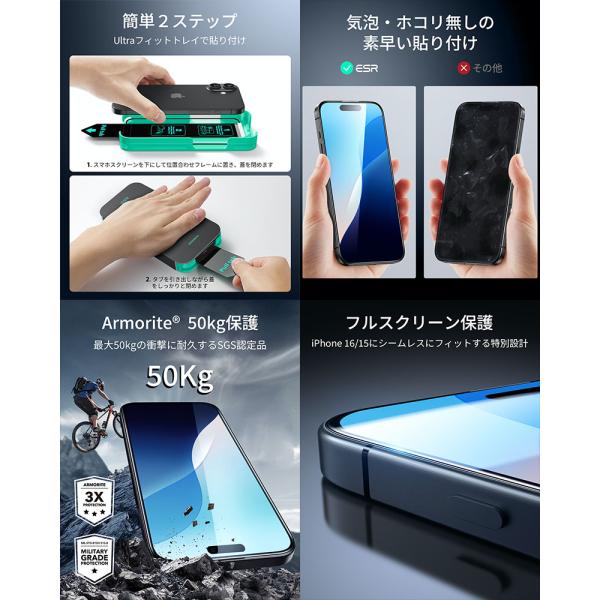 ESR イーエスアール iPhone 16 / 15 Armorite Screen Protector 負荷耐性50kg 超強化ガラスフィルム 光沢 0.33mm ESR669