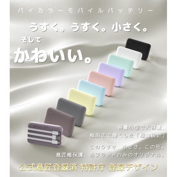 PD 急速 超マット加工 超薄 小型 バイカラー モバイルバッテリー 10000mAh 大容量 軽量 小型 ミニ iPhone 16 15 タイプC ケーブル内臓 日本ブランド