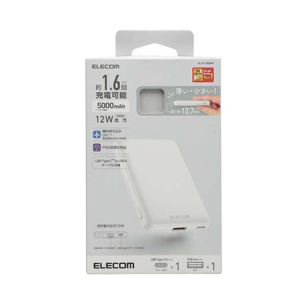 エレコム モバイルバッテリー 薄型コンパクト 5000mAh / 2.4A / Cx1+Ax1 リチウムイオン電池 おまかせ充電対応 12W対応 ホワイト DE-C37-5000WH 在庫処分