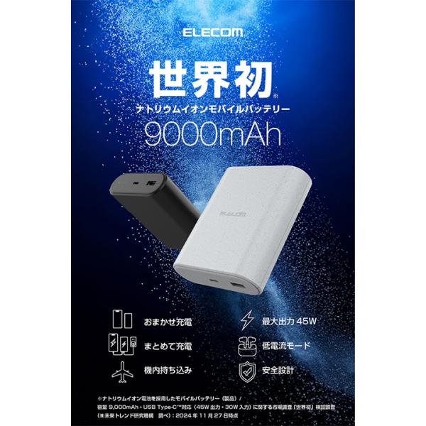 エレコム モバイルバッテリー ナトリウムイオン電池 9000mAh 45W パワーデリバリー USB Type-C入出力1ポート USB-A出力1ポート ライトグレー DE-C55L-9000LGY