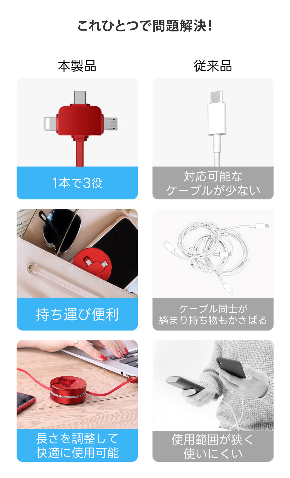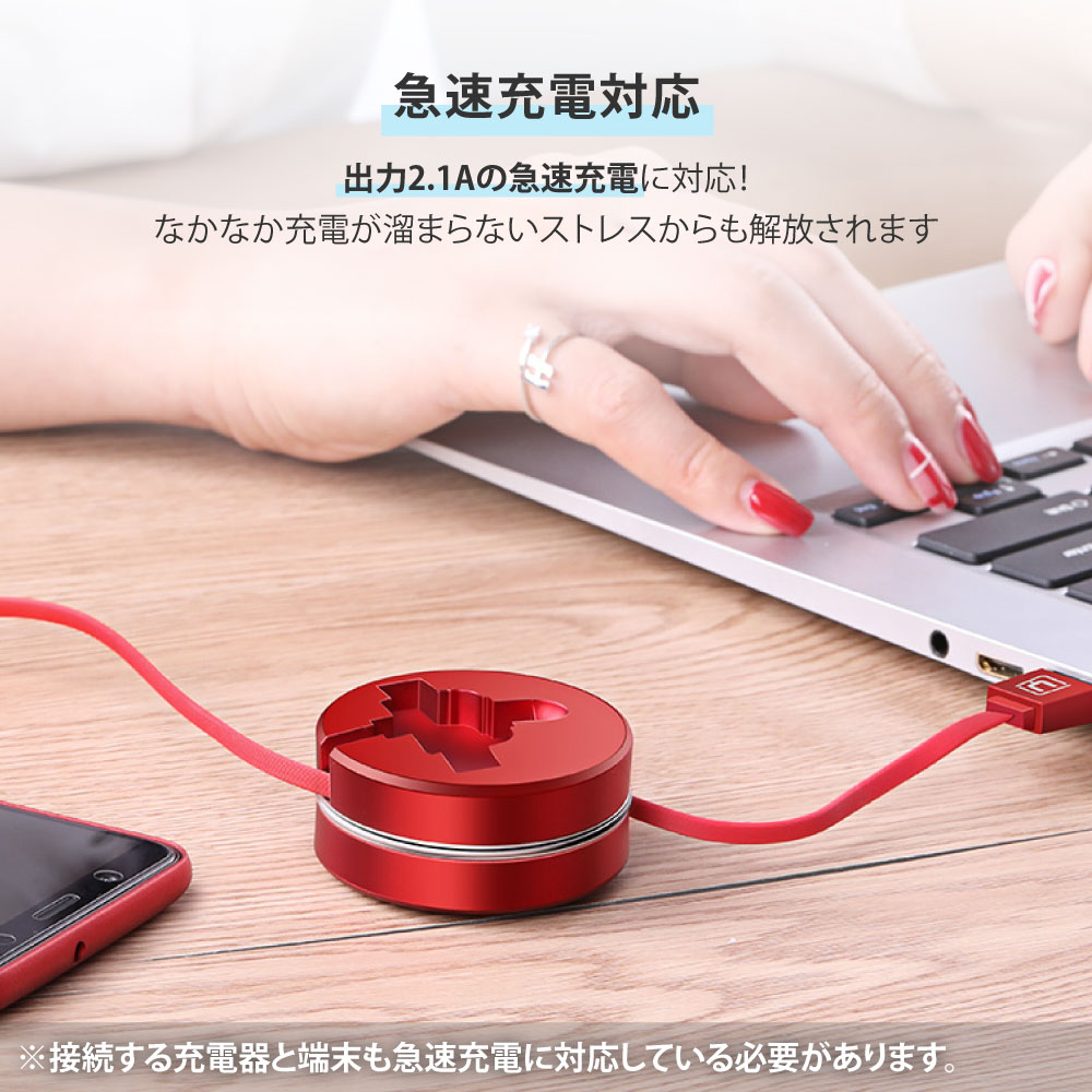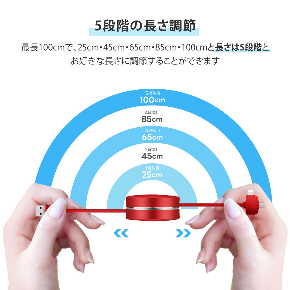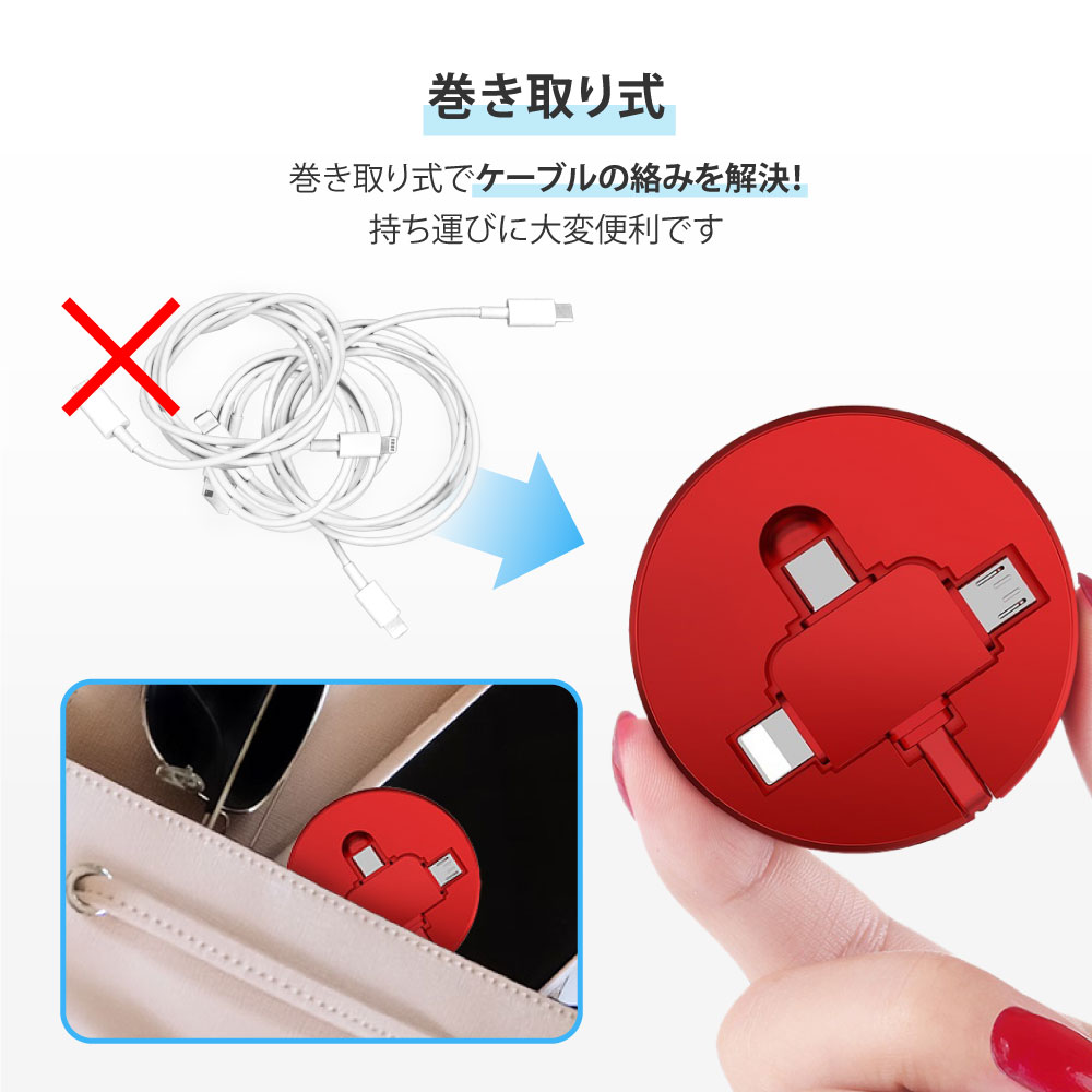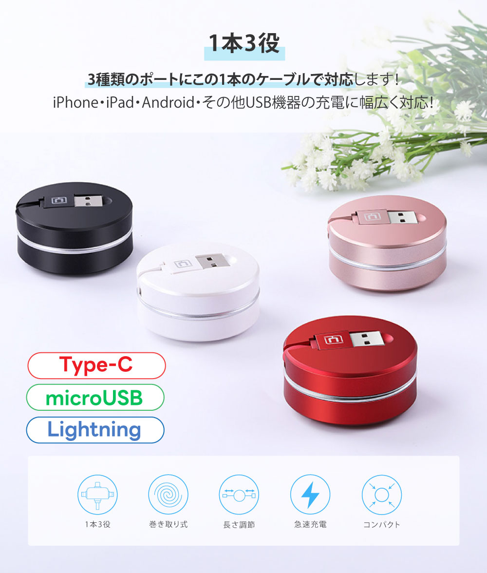 充電ケーブル CAFELE 3in1 iPhone対応 Android Type-C Lightning microUSB 巻き取り 巻取り 式 アンドロイド USB