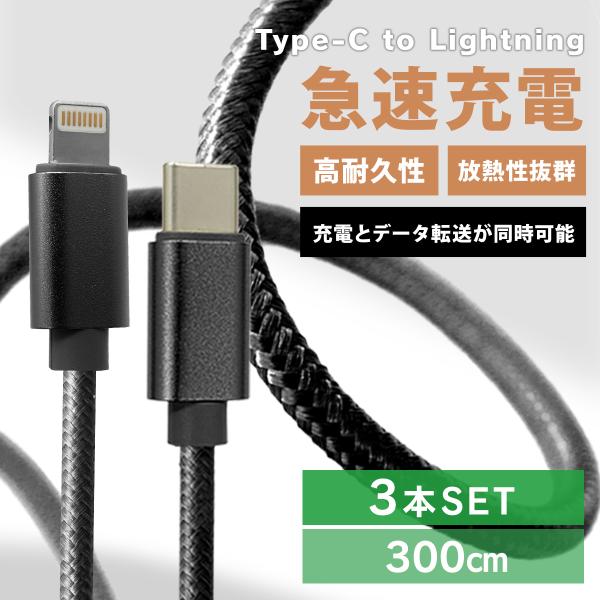 充電器 急速充電 iPhone ライトニングケーブル 3本セット 充電ケーブル 3m Type-C to Lightning タイプC 断線防止 高性能チップ USB ナイロン編み