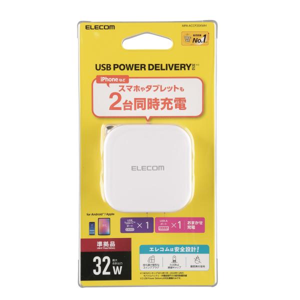 エレコム スマホ・タブレット 用 AC充電器 USB Power Delivery 20W+12W AC充電器 C×1+A×1 Type-C 1ポート USB-A 1ポート ホワイト MPA-ACCP20XWH
