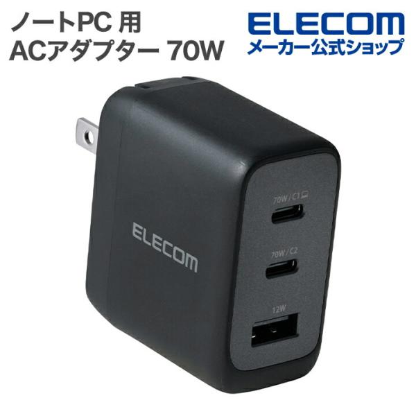 エレコム ノートPC 用 ACアダプター 70W C×2+A×1 AC充電器 USB充電器 AdjustCharge搭載 USB Power Delivery スイングプラグ ブラック ELECOM MPA-AC12770BK