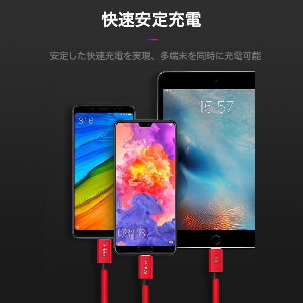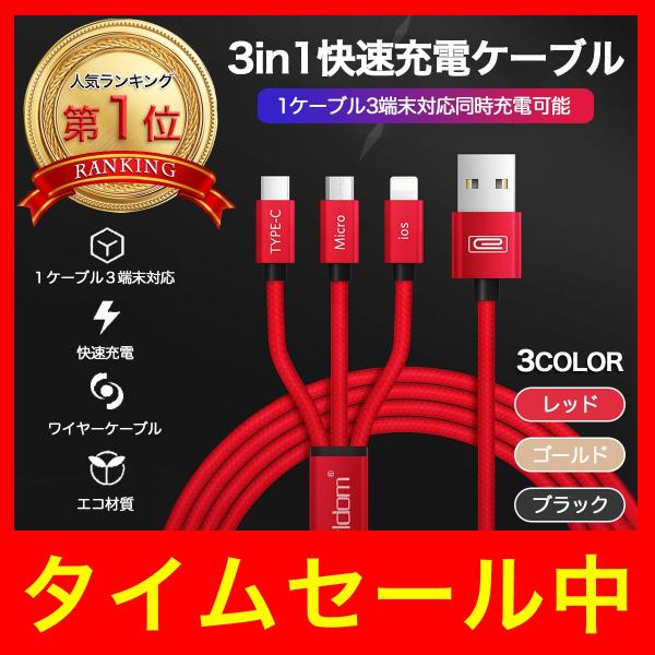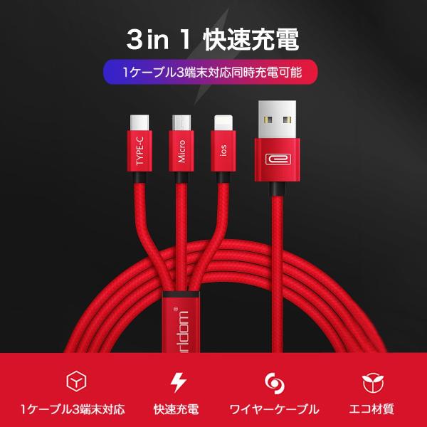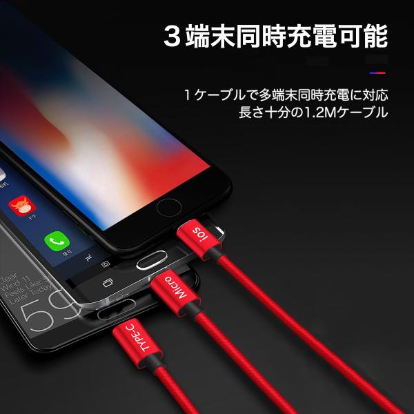 充電ケーブル 3in1 急速充電 1.2m iPhone Android Type-C microUSB Lightning アイフォン アンドロイド タイプC ライトニング 送料無料