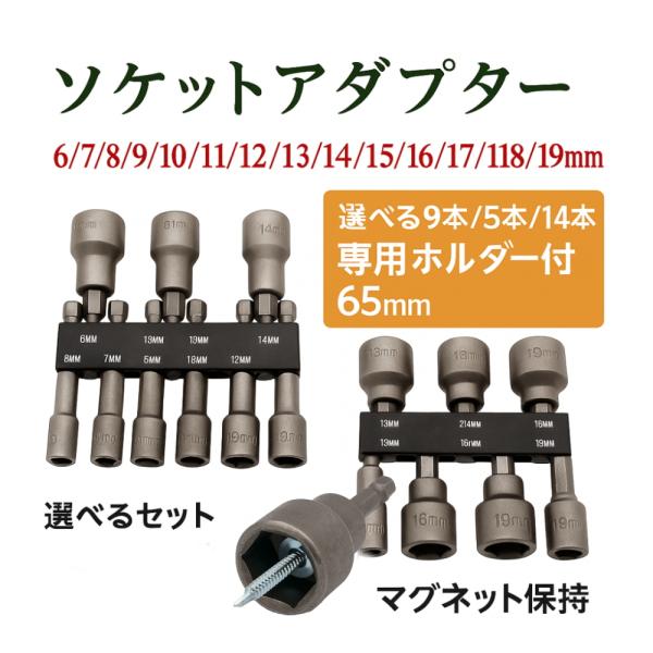 整理ホルダー付 ソケットアダプター 6〜19mm 14本セット 65mm マグネット付 ナットドライバー化 六角シャンク6.35mm