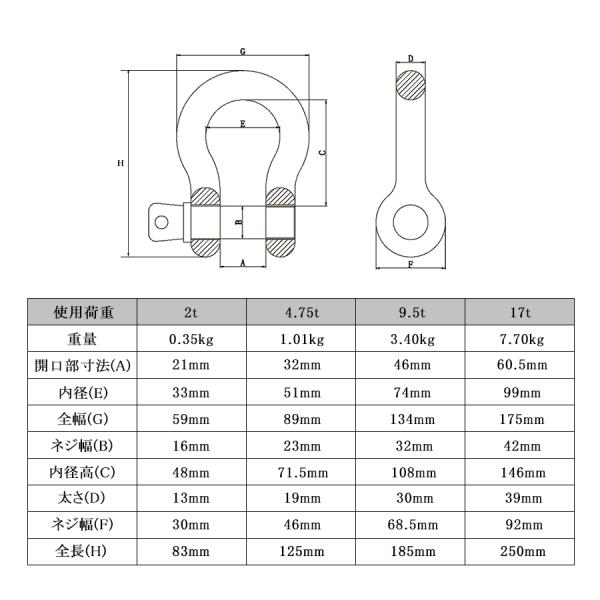 シャックル バウ型 弓型 ボルト 捩込 捻込 ねじ込み タイプ 使用荷重 9.5t 連結 金具 レッカー車 積載車 ローダー レッカー用品 レッカー作業 道具 工具