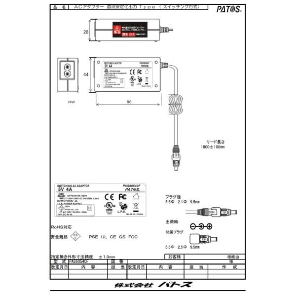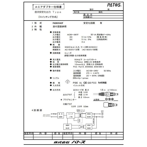 【安心の国内メーカー品】PATOS(パトス) 汎用スイッチングACアダプター DC5V4A PAS60540F 直流安定化出力電源【PSE RoHS対応】[メール便][送料無料]