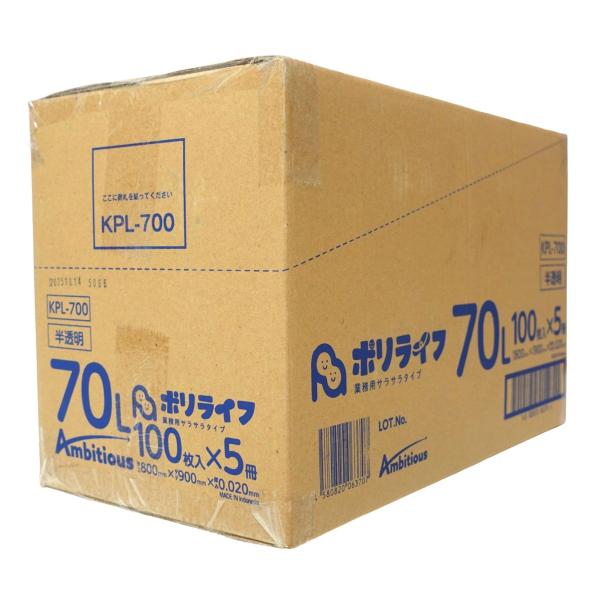 ゴミ袋 70L 半透明 袋入り 100枚 0.020mm厚 100枚x5冊入り ( 500枚) 1冊あたり1180円 1枚11.8円 HDPE素材 ポリ袋 ビニール袋 KPL-700
