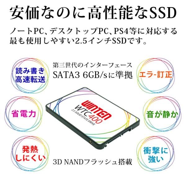 【バルク品】WINTEN SSD 256GB 内蔵型SSD 3年保証 2.5インチ SATA3 6GB/s 3D NAND PS4 動作確認済 フラッシュ搭載 エラー訂正 省電力 WTC400-SSD-256GB 6132